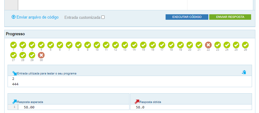No exemplo desta imagem, o código que a pessoa fez deu certo em 28 dos 30 testes realizados. Apenas 2 testes, que estão vermelhos, deram errado. Ou seja, se a questão valesse 10 pontos, a pessoa ficaria com 9.3.