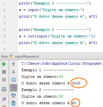 Note que o primeiro exemplo diz que calcula o dobro mas dá o resultado errado, pois faltou converter o resultado do input em um número (int ou float) antes de fazer a conta.