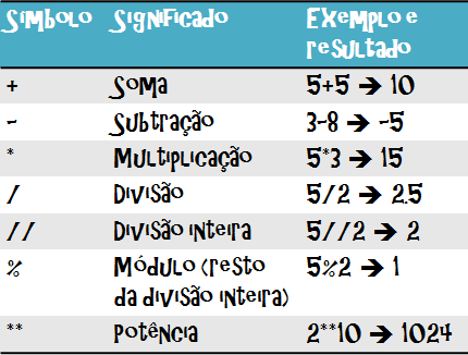 Dá pra fazer contas com o Python como se fosse uma calculadora, com esses símbolos: