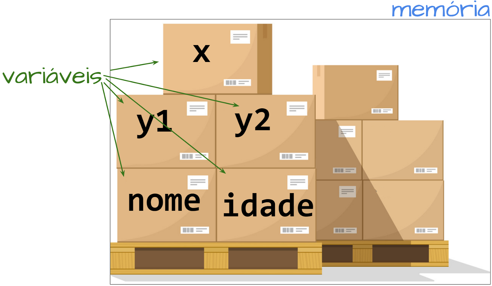 O sistema operacional separa pedaços da memória para cada programa utilizar. A gente pode pensar na memória do nosso programa como sendo um grande depósito, onde cabem várias caixinhas (variáveis).
